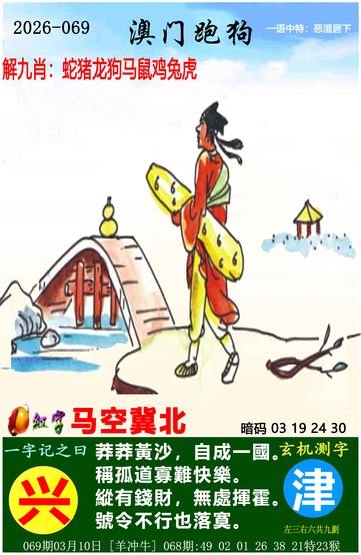 069期:⑨肖 | 兔龙虎鼠羊牛蛇狗猴 | 开:?00中 |